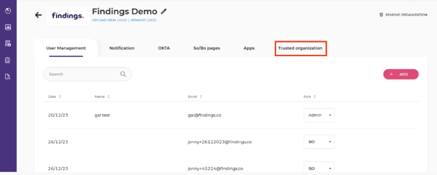 This guide showcases, step-by-step, how to add a trusted organization on the Findings platform.